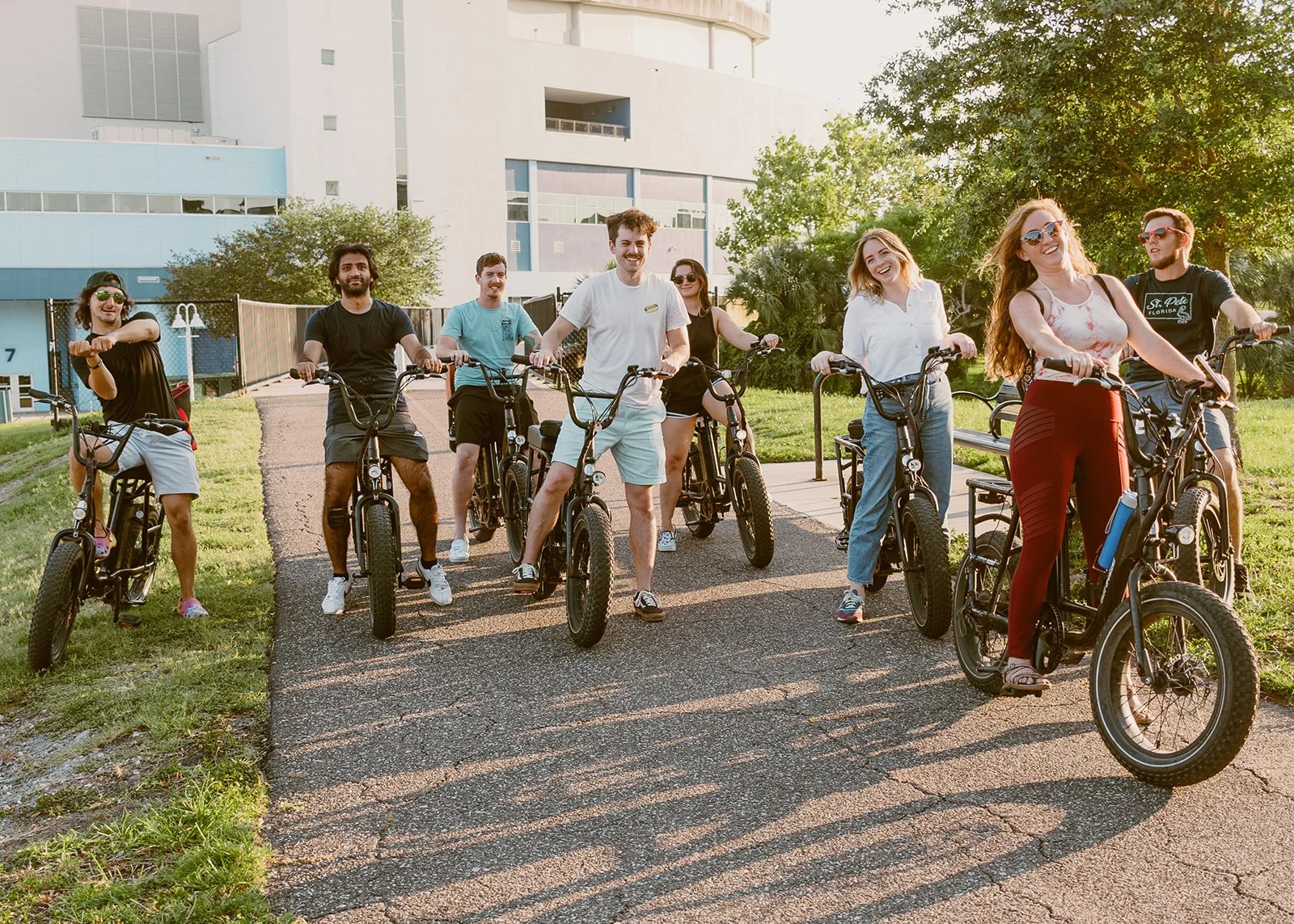 We meet at Flora Wylie Park, downtown St Petersburg, FL. We provide helmets and instructions on how to use your e-bike. We have had all sizes from 4’9 to 6’9 ride our Rad Runner Utility E-Bikes!